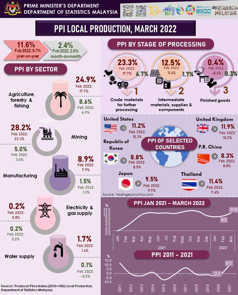 The full publication of the Producer Price Index Malaysia, March 2022 can be downloaded from eStatistik portal.