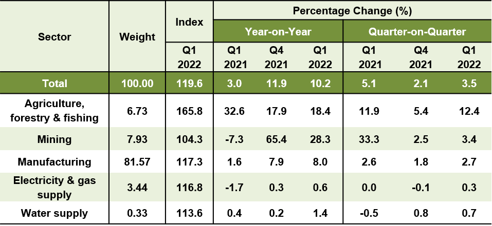 In the first quarter of 2022, the PPI local production posted an increase of 10.2 per cent (Q4 2021: 11.9%). The increase was led by indices of Mining (28.3%), Agriculture, forestry & fishing (18.4%), Manufacturing (8.0%), Water supply (1.4%) and Electricity & gas supply (0.6%). Meanwhile, a quarter-on-quarter comparison showed that PPI local production increased 3.5 per cent as opposed to 2.1 per cent recorded in the fourth quarter of 2021.