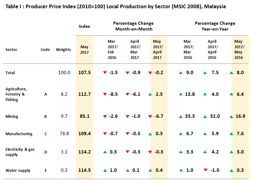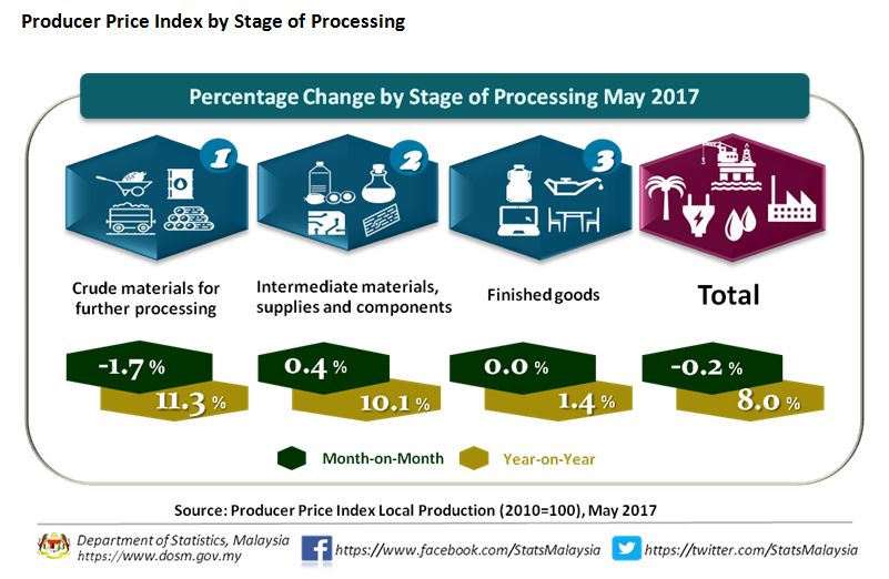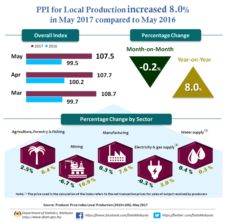 Year-on-year comparison showed that the Producer Price Index (PPI) for local production increased 8.0 per cent in May 2017. The highest increase was recorded by Mining index (+16.9%) followed by Manufacturing (+7.6%), Agriculture, forestry & fishing (+6.4%), Electricity & gas supply (+3.0%) and Water supply (+0.3%).