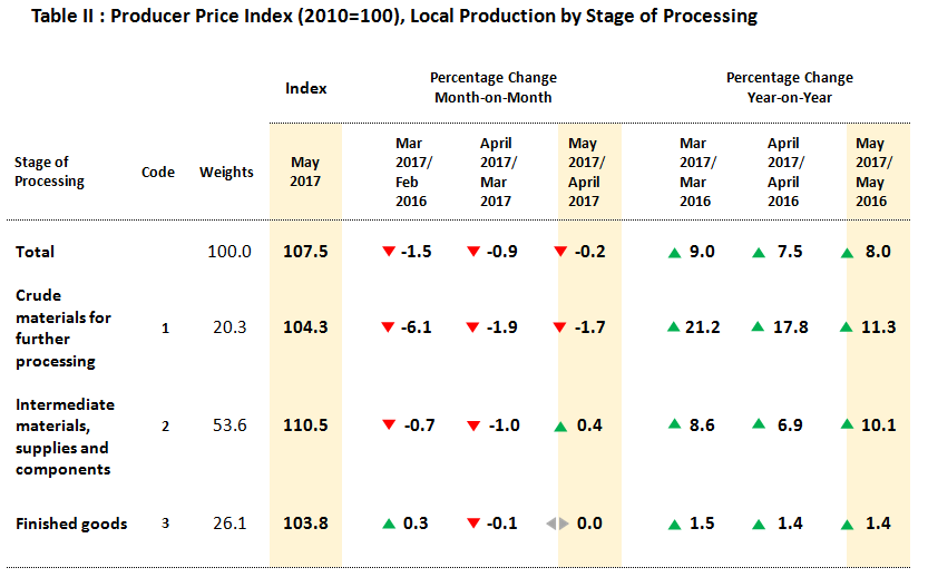 As compared with the same month a year ago, the PPI for local production by SOP for May 2017 increased 8.0 per cent. This was due to increases in index for Crude materials for further processing (+11.3%), Intermediate materials, supplies and components (+10.1%) and Finished goods (+1.4%). [Table II]