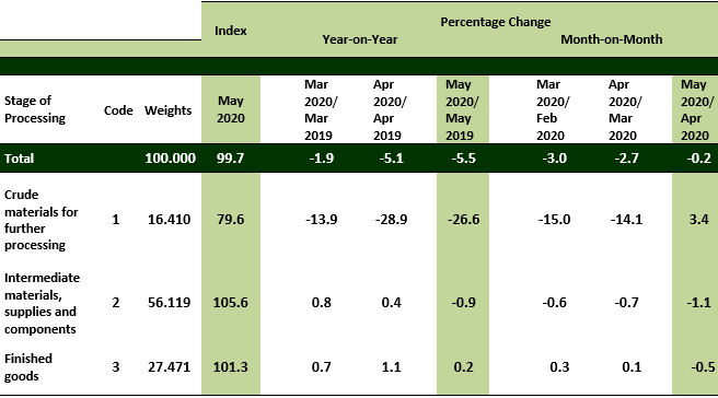 The PPI local production by stage of processing in May 2020 for Crude materials for further processing and Intermediate materials, supplies & components decreased 26.6 per cent and 0.9 per cent respectively as compared to the same month of the preceding year. Meanwhile, Finished goods rose 0.2 per cent.