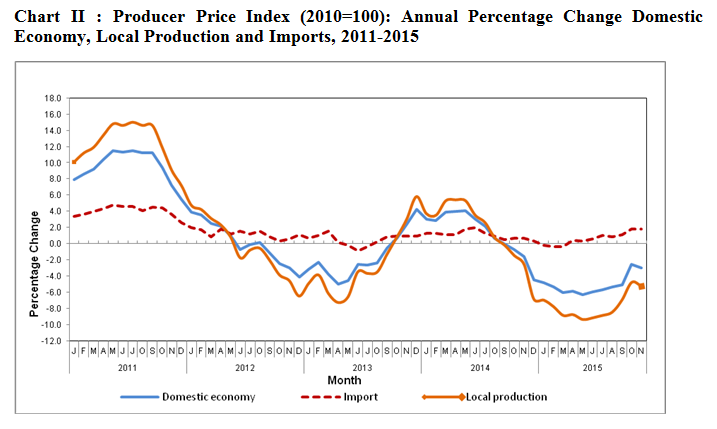 Year-on-year comparison showed that the PPI for domestic economy in November 2015 decreased by 3.0 per cent with local production index dropped by 5.3 per cent while the import price index increased by 1.8 per cent.(Table I)