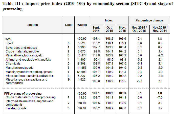 The import price index by SOP for November 2015 inclined by 1.8 per cent compared to November 2014. The increase in the prices was mainly due to increases in the index for Intermediate materials, supplies and components (+3.2%) and Finished goods (+1.7%). While, index for Crude materials for further processing decreased by 7.0 per cent.