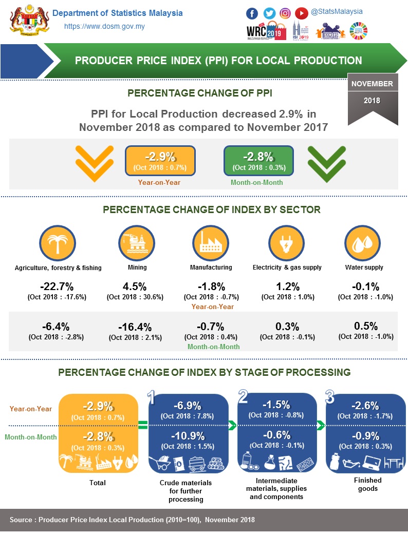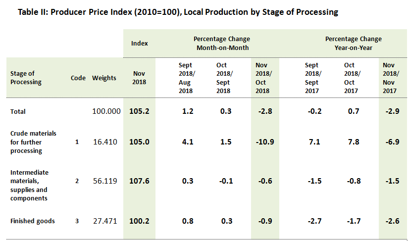The PPI for local production by stage of processing (SOP) declined 2.8 per cent in November 2018 from the previous month. It was led by the decline of all indices of which Crude materials for further processing (-10.9%), Finished goods (-0.9%) and Intermediate materials, supplies & components (-0.6%).