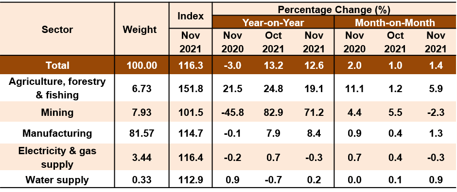 In terms of month-on-month comparison, the PPI local production rose 1.4 per cent in November 2021. The increase was due to a 5.9 per cent rise in Agriculture, forestry & fishing index, mainly contributed by the indices of Growing of perennial crops (8.3%), Growing of non-perennial crops (3.0%) and Animal production (1.2%). The index of Oil palm fresh fruit bunches remained virtually unchanged over concerns of insufficient migrant labour in Malaysia’s plantations. On the other hand, the price of Crude oil slumped due to a discovery of a new COVID-19 variant named Omicron which was first detected in South Africa that led to fears of its spread hence slowing demand over the commodity. This contributed to a 2.3 per cent drop in Mining index as opposed to 5.5 per cent increase recorded last month.