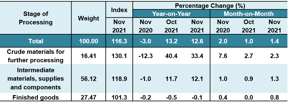 The index of Crude materials for further processing rose 33.4 per cent over 12.3 per cent decrease recorded in the same month of the preceding year. The increase was led by higher prices of Crude oil and Oil palm fresh fruit bunches. The indices for vegetables namely Tomatoes, Round cabbage, Egg-plants and Chinese mustard also inclined. Similarly, the Intermediate materials, supplies & components index also climbed 12.1 per cent as compared to 1.0 per cent decline in November 2020. Among the products that contributed to the increase in this index were Liquefied natural gas (LNG), Crude palm oil, Palm olein (RBD), Integrated circuits, Aluminium, Rubber (SMR), Mild steel round bar and Mixed poultry feed. However, the index of Finished goods registered a decrease of 0.1 per cent due to a drop in the indices of Personal computers and Rubber gloves (Examination).