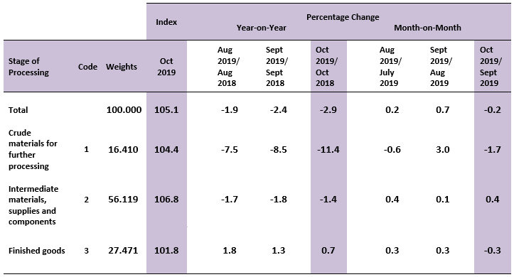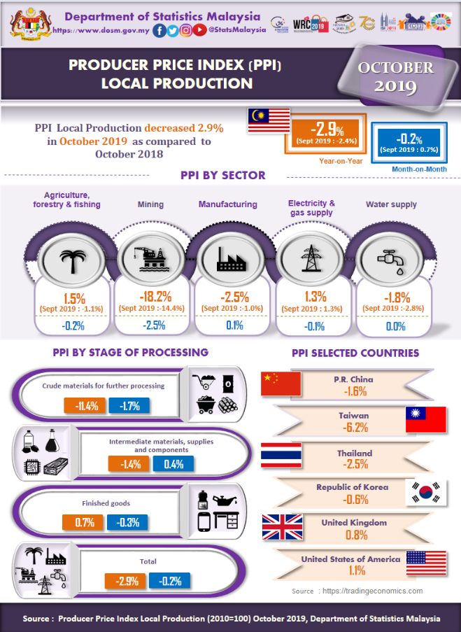 In October 2019, the PPI local production by stage of processing (SOP) declined 2.9 per cent as compared to October 2018. It was contributed by Crude materials for further processing (-11.4%) and Intermediate materials, supplies & components (-1.4%). However, the index for Finished goods rose 0.7 per cent.