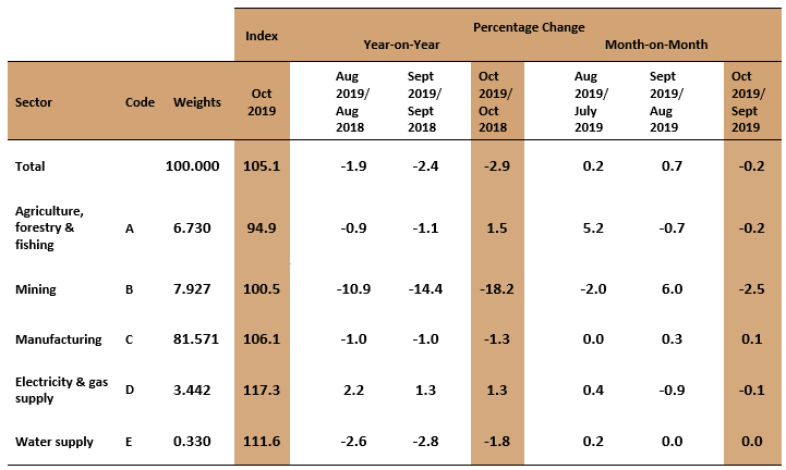The Producer Price Index (PPI) local production declined 2.9 per cent in October 2019 to 105.1 as against 108.2 in the same month of the preceding year. The index of Mining declined 18.2 per cent, followed by Water supply (-1.8%) and Manufacturing (-1.3%) indices. In contrast, the index of Agriculture, forestry & fishing and Electricity & gas supply rose 1.5 per cent and 1.3 per cent respectively.