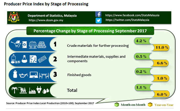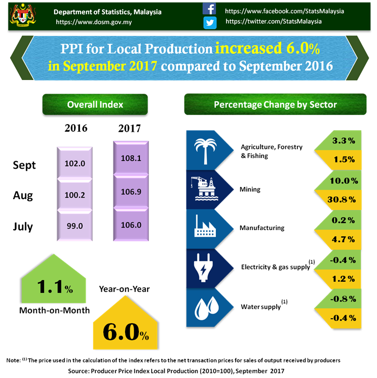 The Producer Price Index (PPI) for local production rose 6.0 per cent on a year -on- year basis in September 2017, 0.7 points lower compared to 6.7 percent in August 2017. Among the sectors which showed significant increases during this period were Mining (+30.8%), Manufacturing (+4.7%), Agriculture, forestry & fishing (+1.5%) and Electricity & gas supply (+1.2%). Meanwhile, the index for Water supply decreased by (-0.4%).
