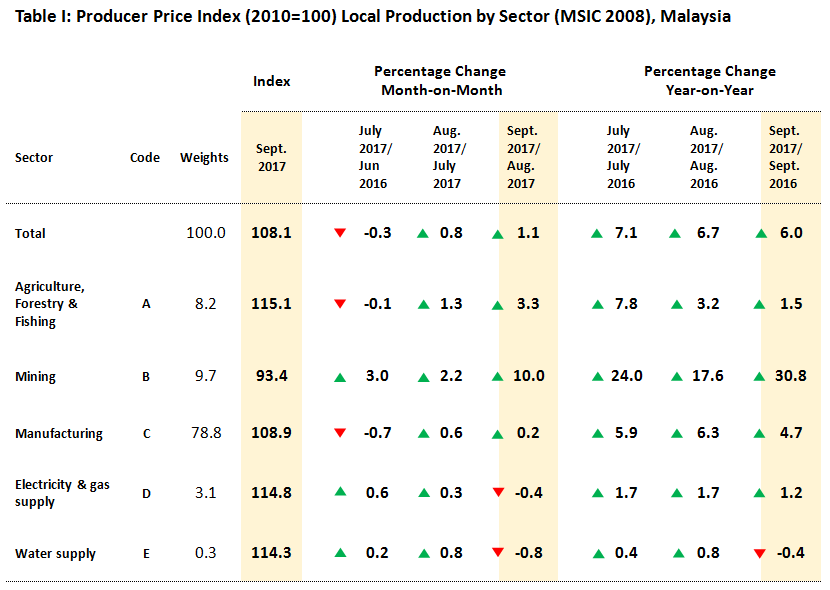 On a monthly basis, PPI for local production inclined by 1.1 per cent in September 2017. The increase was driven by three sectors namely, Mining (+10.0%), Agriculture, forestry & fishing (+3.3%) and Manufacturing (+0.2%). Meanwhile, the indices for Water supply and Electricity & gas supply registered decreases by (-0.8%) and (-0.4%) respectively. [Table I]