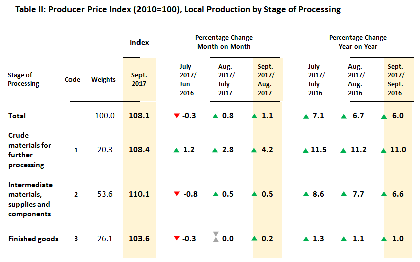 As compared with the same month a year ago, the PPI for local production by SOP for September 2017 increased 6.0 per cent. The increases were fuelled by the index for Crude materials for further processing (+11.0%), Intermediate materials, supplies and components (+6.6%) and Finished goods (+1.0%). [Table II]