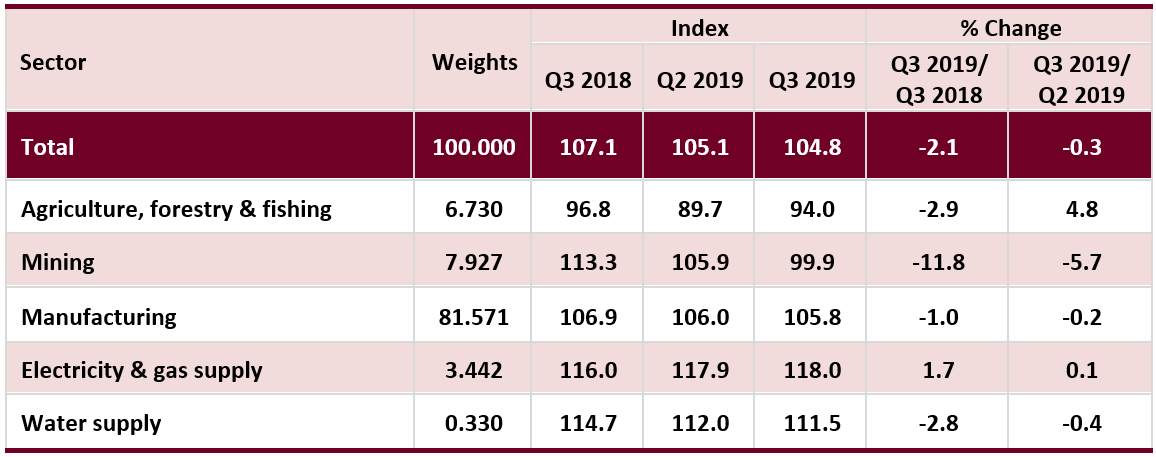 PPI local production for the third quarter 2019 decreased 2.1 per cent to 104.8 as compared to 107.1 in the same quarter of the previous year. The decline was contributed by Mining (-11.8%), Agriculture, forestry & fishing (-2.9%), Water supply (-2.8%) and Manufacturing (-1.0%) indices. Meanwhile, the index of Electricity & gas supply showed an increase of 1.7 per cent. On a quarterly basis, the PPI local production decreased 0.3 per cent as compared to the second quarter of 2019. [Table 2]