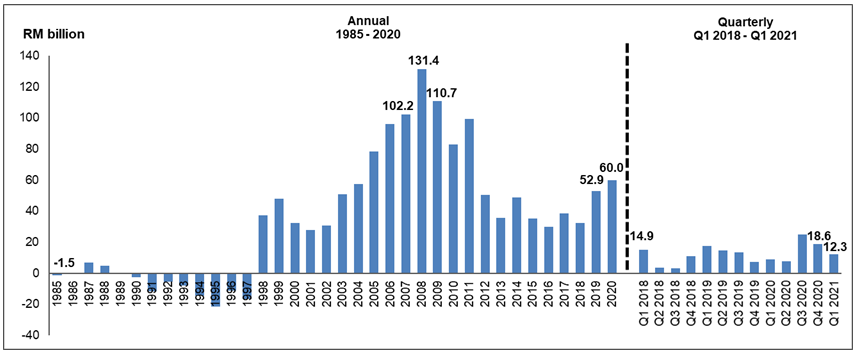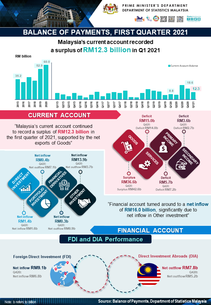 Malaysia's Current Account Surplus for Q1 2021 increased 39.1 per cent year-on-year to record RM12.3 billion
