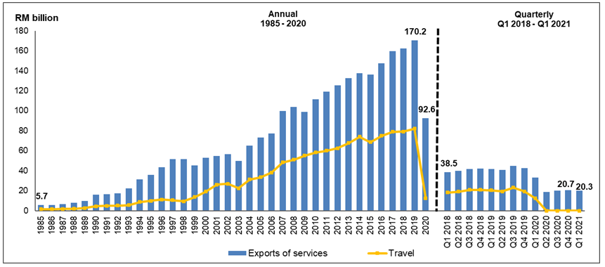 Nevertheless, Services logged a higher deficit of RM15.0 billion as compared to the fourth quarter of 2020 due to Travel, Construction and Other Business Services. The continuous closure of border caused by the pandemic has led Travel, the major contributor of Services, to remain in the negative trend by recording a deficit of RM3.4 billion. Adding to this, the higher deficit in Services was further attributed by Other Business Services which recorded a deficit of RM0.8 billion especially for payments in technical and trade related services, as well as Construction at a deficit of RM0.7 billion owing to new projects. Exports of Services declined by 1.9 per cent quarter-on-quarter to RM20.3 billion in the first quarter of 2021 while imports increased by 1.4 per cent to record RM35.2 billion.