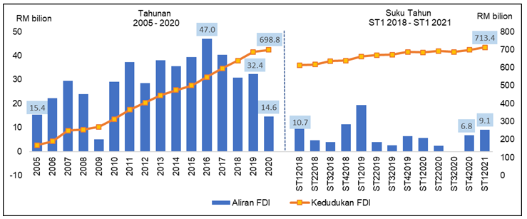 As at end of first quarter 2021, FDI position recorded RM713.4 billion while DIA position was RM539.8 billion. Malaysia’s International Investment Position (IIP) registered a higher net assets position of RM106.4 billion as compared to RM67.5 billion in the previous quarter. The international reserves stood at RM450.8 billion as compared to RM432.3 billion in the preceding year.