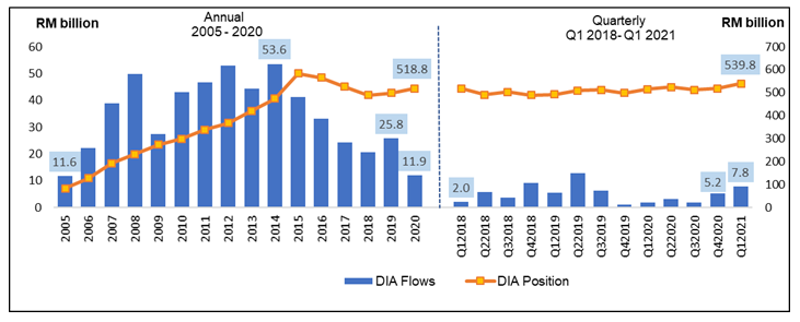 In the first quarter of 2021, financial account turned around to register a net inflow of RM16.0 billion from a net outflow of RM10.2 billion in the previous quarter. This was credited by higher inflow in Other investment at RM13.9 billion, mainly contributed by interbank borrowing from abroad. Meanwhile, Foreign Direct Investment (FDI) recorded a net inflow of RM9.1 billion as compared to RM6.8 billion last quarter. The FDI inflow was primarily channelled into Manufacturing, Financial and Wholesale & retail trade sectors; particularly from Singapore, United Kingdom and Netherlands. Simultaneously, Direct Investment Abroad (DIA) also registered a higher outflow of RM7.8 billion as against RM5.2 billion in the final quarter of last year. Financial, Mining and Manufacturing were the major sectors for DIA while the main destinations were Canada, Indonesia and Singapore.