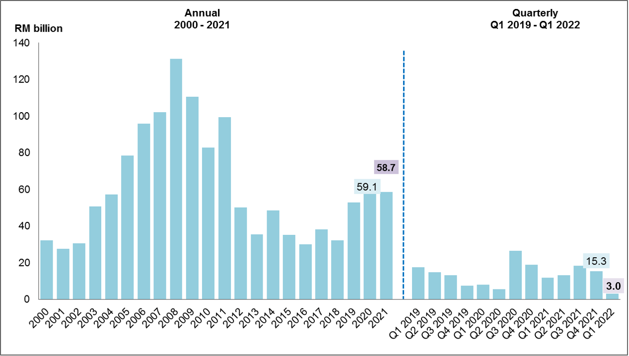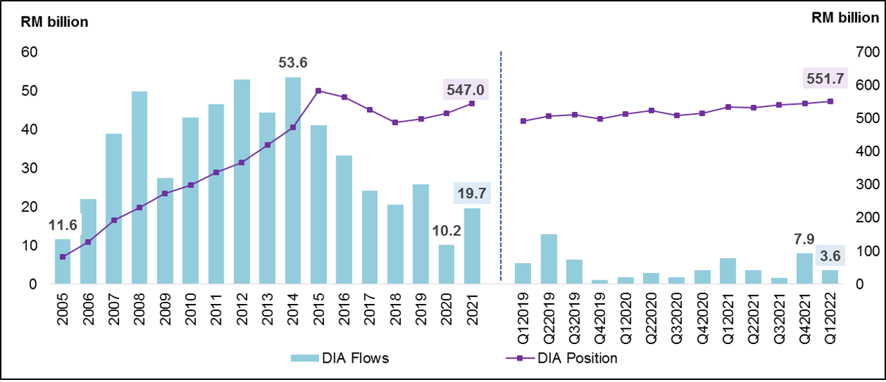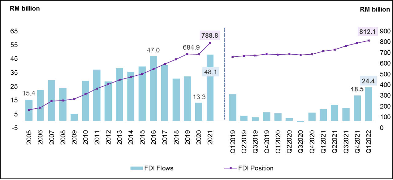 Chart 3: Foreign Direct Investment (FDI) in Malaysia Flows and Position, 2005 – 2021 and Q1 2019 – Q1 2022