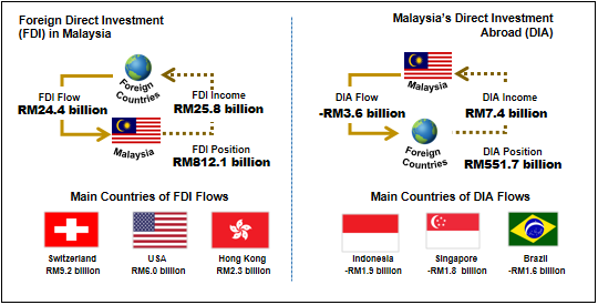 In terms of investment, Foreign Direct Investment (FDI) expanded by RM5.9 billion to record a net inflow of RM24.4 billion for the first quarter. As observed in Direct investment, the inflow was mainly contributed by higher settlement of trade credits by affiliates abroad and injection of equity. Manufacturing sector remains the main attraction for foreign investors in Malaysia, followed by the Services primarily in Financial and Wholesale & retail trade activities. The main sources of FDI came from Switzerland, the USA and Hong Kong. In the meantime, Direct Investment Abroad (DIA) recorded a lower net outflow of RM3.6 billion compared to RM7.9 billion in the preceding quarter, which was due to higher inflow in debt instruments. The major contributors to the outflows were Services, particularly in Financial activities, followed by Manufacturing and Agriculture sectors. The top three DIA destinations were Indonesia, Singapore and Brazil.