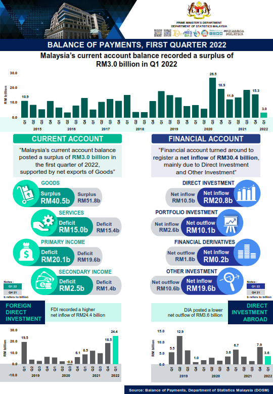 Malaysia’s Current Account Balance records a surplus of RM3.0 billion while FDI remained high at RM24.4 billion in Q12022, mainly driven by