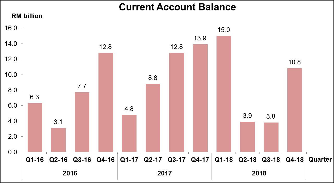 Malaysia’s current account surplus surged to RM10.8 billion in the final quarter of 2018 as compared RM3.8 billion in previous quarter. The favourable performance was spurred by larger surplus in goods account at RM33.0 billion from RM26.6 billion in the previous quarter. Meanwhile, financial account recorded a net outflow of RM6.1 billion (Q3 2018: net inflow RM2.3 billion). For the year 2018, the current account surplus reached RM33.5 billion contributed by higher surplus in goods account and lower deficit in services account.