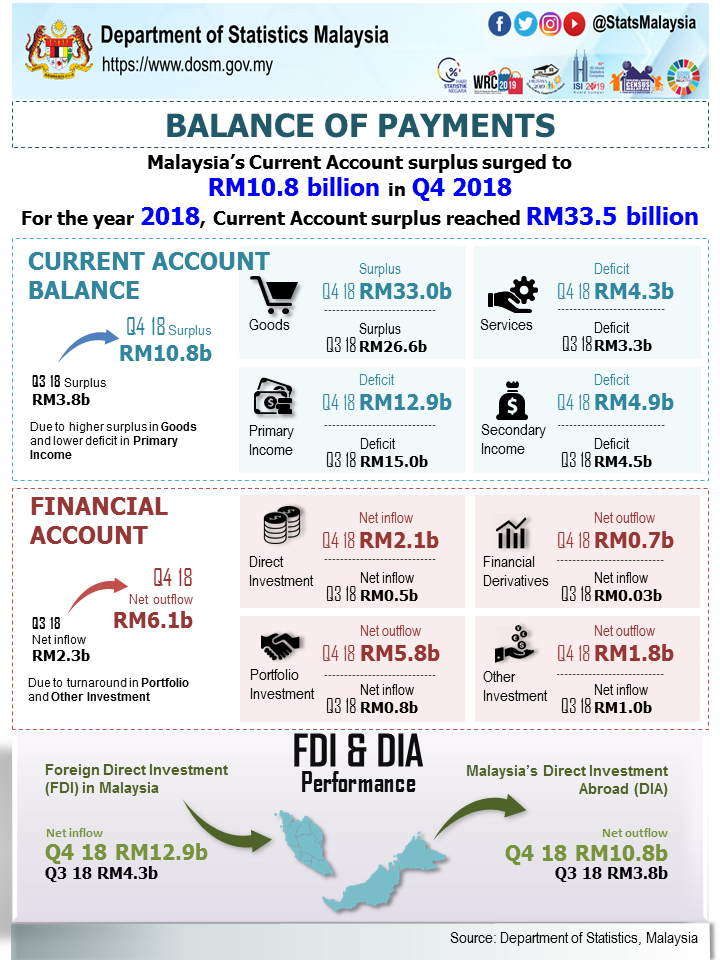 Foreign Direct Investment (FDI) accelerated to RM12.9 billion from RM4.3 billion in the previous quarter. The FDI were mainly from Netherlands, Japan and Hong Kong. Similarly, Malaysia’s Direct Investment in Abroad (DIA) also registered a higher net outflow of RM10.8 billion with the main destinations to Canada, Indonesia and Singapore. In 2018, FDI in Malaysia recorded RM32.6 billion while DIA was RM21.3 billion.