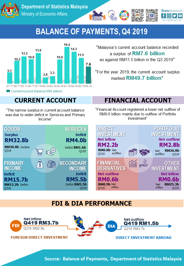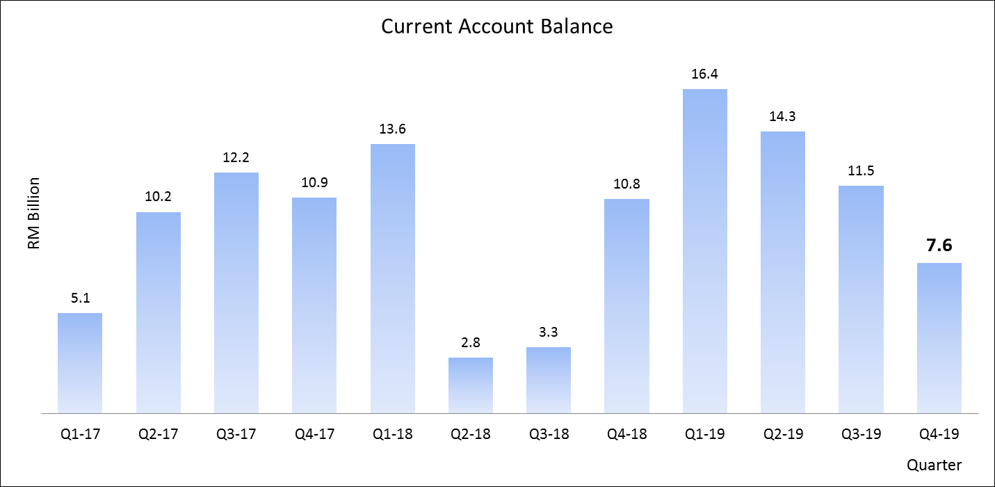 In 2019, the current account surplus hit the highest value of RM49.7 billion since 2012 (RM50.2 billion) despite turned downward in the second half of the year. The favourable performance was contributed by higher surplus in goods account at RM125.5 billion and smaller deficit in services account at RM10.9 billion.