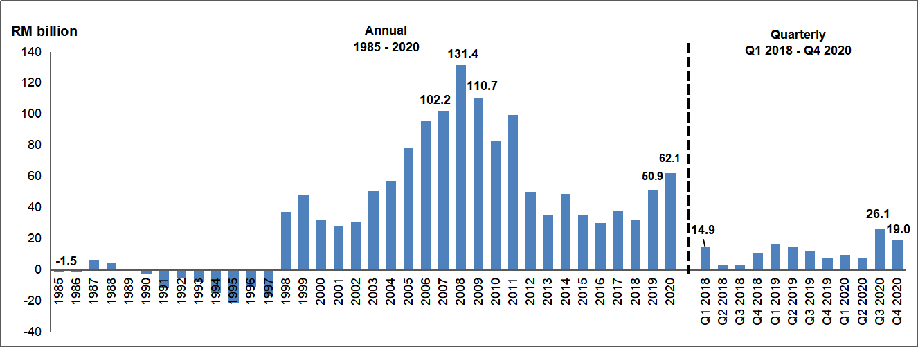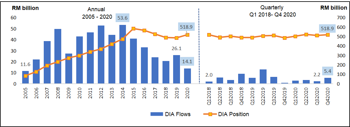 On the Financial front, this account marked a higher outflow of RM79.1 billion in 2020 as against RM33.8 billion a year ago. This owing to higher outflows in Portfolio assets and Other investment. FDI showed a net inflow of RM13.9 billion as against RM31.7 billion. Although, the FDI flow decreased, the FDI position surged by RM14.4 billion to record RM703.5 billion in 2020. Meanwhile, DIA recorded a net outflow of RM14.1 billion as compared to RM26.1 billion in the previous year.