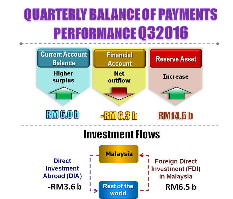 In the third quarter of 2016, Malaysia's Balance of Payments recorded a surplus on current account of RM6.0 billion compared to RM1.9 billion in the previous quarter. Meanwhile, financial account posted a net outflow of RM6.3 billion (Q2 2016: net inflow RM9.5 billion) and international reserves of Bank Negara Malaysia increased by RM14.6 billion (Q2 2016: increase by RM8.8 billion).