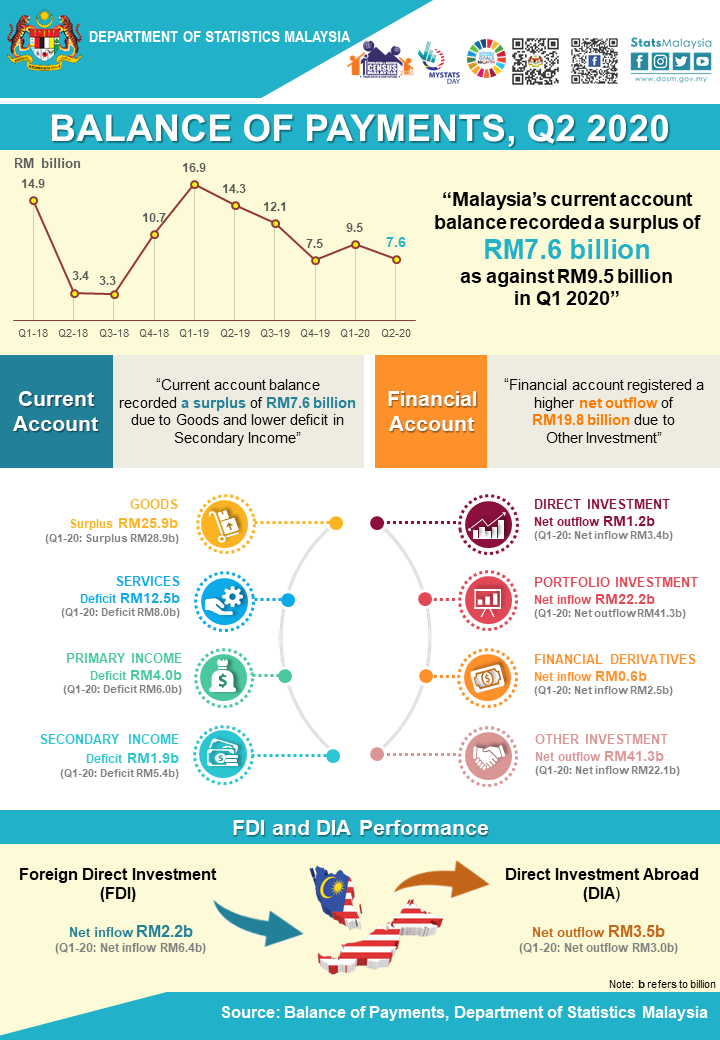 In the second quarter of this year, Malaysia’s Current Account Balance (CAB) continued to record a surplus of RM7.6 billion despite the global economic uncertainties and continuous spread of COVID-19. The surplus in CAB was mainly contributed by net exports in Goods of RM25.9 billion and a lower deficit in Secondary Income at RM1.9 billion. Imports of goods dropped at a faster pace as compared to the decline in exports resulting in a favourable performance of overall Goods account. In addition, Secondary Income reached the lowest deficit as the number of foreign workers declined in this quarter that led to lesser money sent abroad.