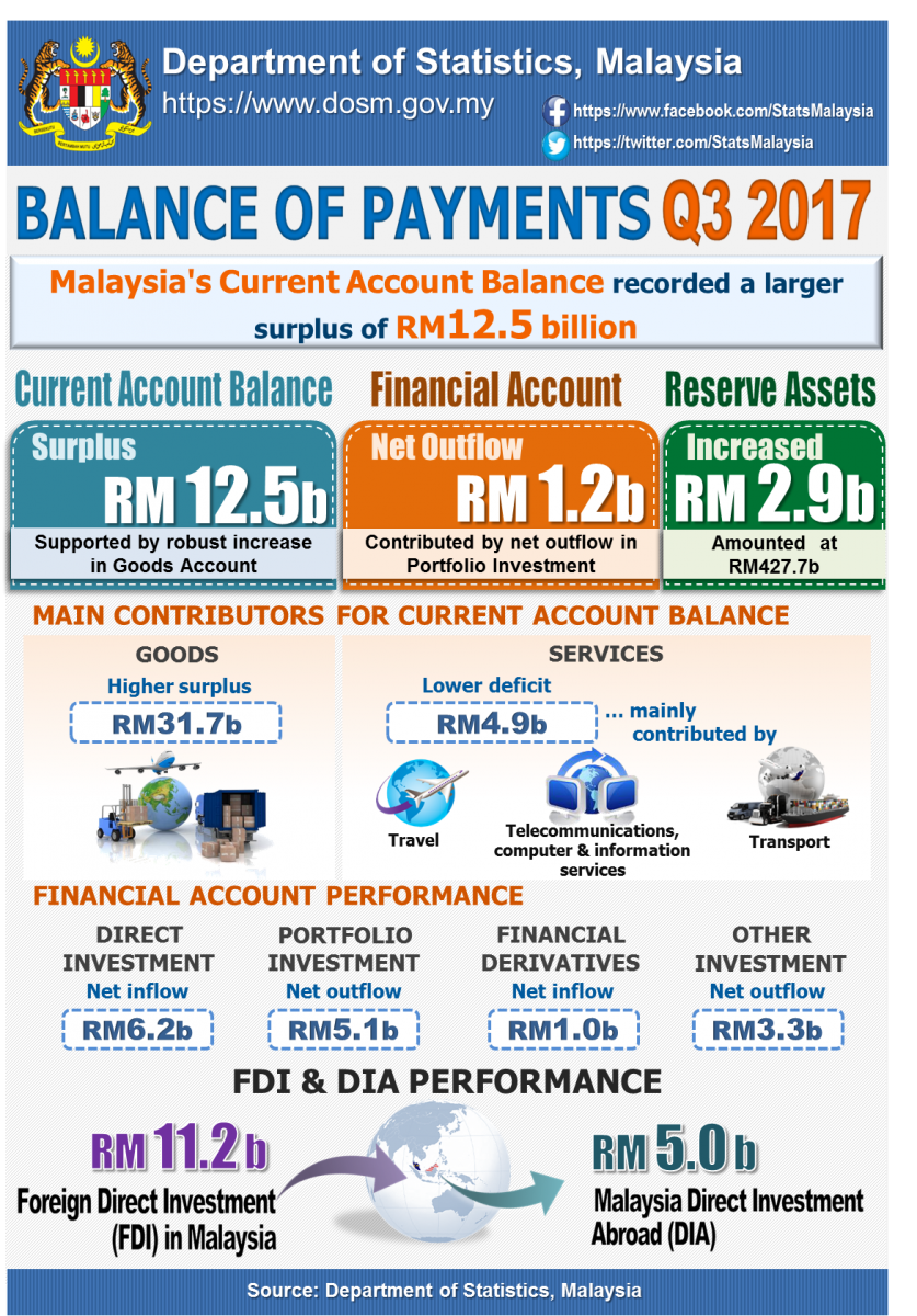 In the third quarter 2017, Malaysia's Balance of Payments recorded a larger surplus of RM12.5 billion as compared to RM9.6 billion in the previous quarter. Meanwhile, financial account recorded a net outflow RM1.2 billion from a net inflow of RM7.3 billion. The international reserves of Bank Negara Malaysia increased by RM2.9 billion in Q3 2017 (Q2 2017: increased RM2.7 billion).