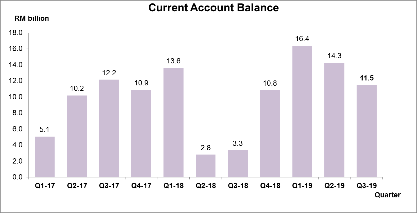 Malaysia’s current account recorded a surplus of RM11.5 billion as compared to RM14.3 billion in the previous quarter. This was led by surplus in Goods Account and lower deficit in Services Account, which was primarily backed by better performance in travel activities. Nevertheless, the overall narrower surplus was influenced by widening deficit in Primary Income due to higher dividend earned by foreign companies. Meanwhile, financial account recorded a net outflow of RM1.3 billion (Q2 2019: net outflow RM18.6 billion) due to higher outflow in portfolio investment. For the period of January to September 2019, the surplus in current account reached RM42.1 billion.