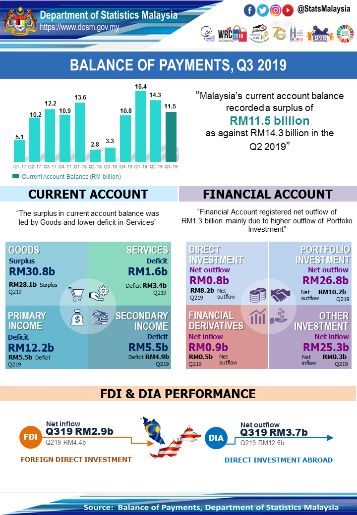 Foreign Direct Investment (FDI) was registered a net inflow of RM2.9 billion in this quarter which was lower than RM4.4 billion in previous quarter. The FDI were mainly from Netherlands, Singapore and Japan. Similarly, Direct Investment Abroad (DIA) registered a lower net outflow of RM3.7 billion from RM12.6 billion in preceding quarter. The main destinations of DIA were Australia, Netherlands and Canada.