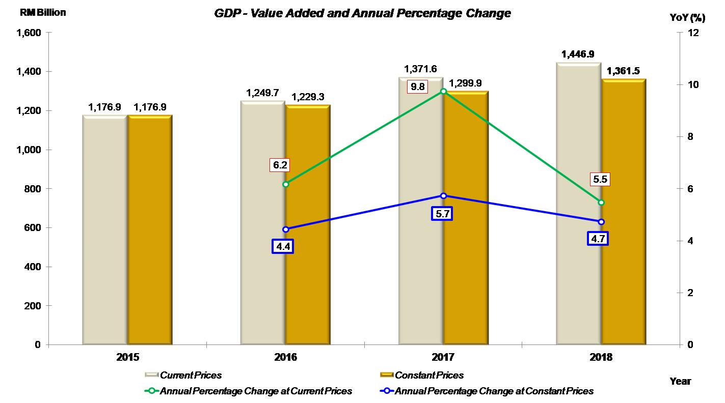 For the year 2018, Malaysia’s economy grew 4.7 per cent (2017: 5.7%) at 2015 constant prices with a value of RM1.36 trillion. Malaysia’s economy recorded an annual average growth of 5.0 per cent during the period 2015 to 2018.