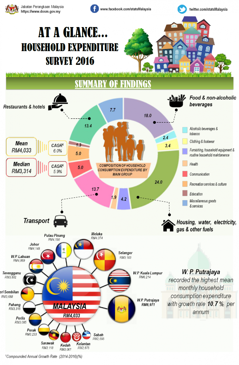 The household consumption expenditure statistics is obtained based on the findings from Household Expenditure Survey (HES) conducted in 2016. The surveys has been carried out using personal interview approach in 12 months period in 2016 covered urban and rural area for all states. The survey is carried out by probability sampling that represents all households in Malaysia.