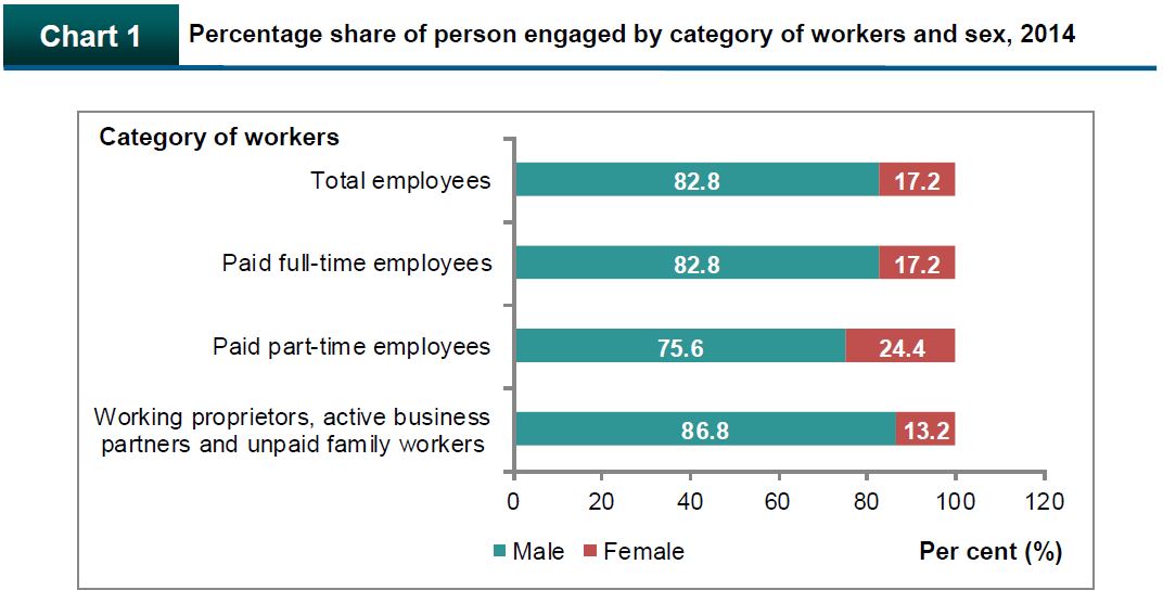 Male workers dominated in this industry with 35,526 persons (82.8%) as compared to female workers with 7,387 persons (17.2%) as shown in Chart 1.