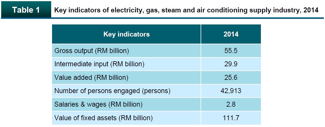 In 2014, the value of gross output registered RM55.5 billion, intermediate input RM29.9 billion and value added RM25.6 billion. The number of persons engaged was 42,913 persons with total salaries & wages paid amounted to RM2.8 billion. Meanwhile, the value of fixed assets was RM111.7 billion as shown in Table 1.