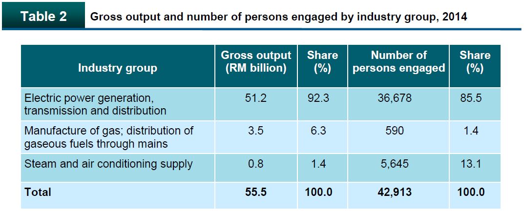 The electric power generation, transmission and distribution was the highest contributor to the value of gross output of RM51.2 billion (92.3%) with a number of persons engaged amounting to 36,678 persons (85.5%). It was followed by manufacture of gas; distribution of gaseous fuels through mains at RM3.5 billion (6.3%) with 590 employees (1.4%). Meanwhile, steam and air conditioning supply posted the value of gross output of RM0.8 billion (1.4%) with 5,645 persons engaged (13.1%) as illustrated in Table 2.