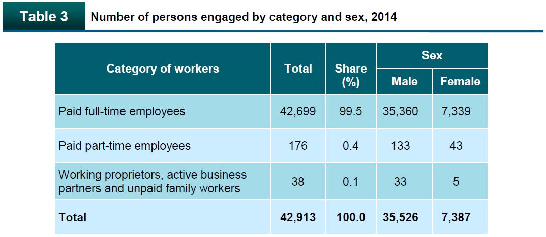 A total of 42,913 persons were engaged in the electricity, gas, steam and air conditioning supply industry. This comprises of paid full-time employees with 42,699 persons (99.5%), paid part-time employees 176 persons (0.4%) and working proprietors, active business partners and unpaid family workers 38 persons (0.1%) as depicted in Table 3.