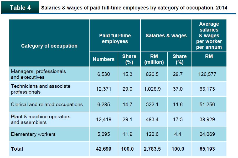 The plant & machine operators and assemblers1 recorded the highest number of employees with 12,418 persons (29.1%) and salaries & wages received was RM483.4 million (17.3%). This was followed by technicians and associate professionals which accounted for 29.0 per cent or 12,371 persons.