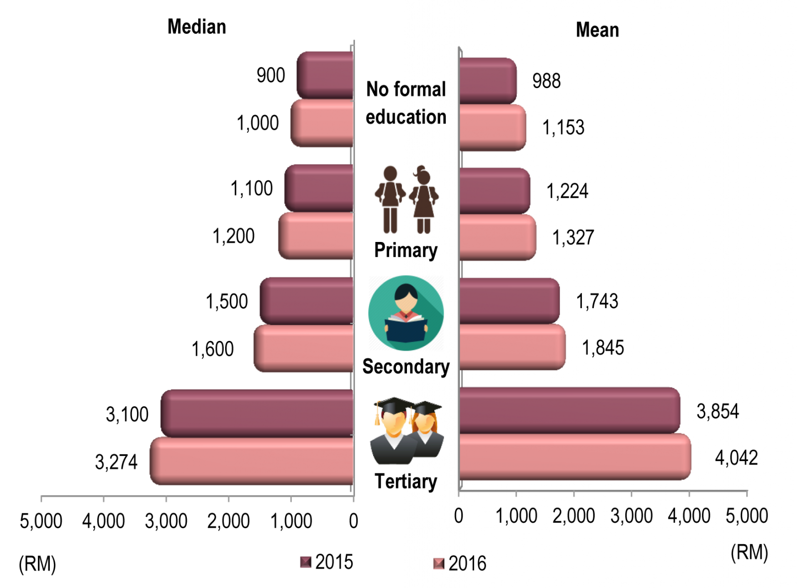 The monthly salaries & wages of the employees with tertiary education was twice the amount received by employees with secondary education in 2015 and 2016. The median monthly salaries & wages of employees with tertiary education was RM3,274 compared to secondary that was RM1,600. Meanwhile, the mean monthly salaries & wages of employees with tertiary education was RM4,042 compared to secondary (RM1,845). Employees with primary education recorded the median monthly salaries & wages RM1,200 and mean RM1,327.