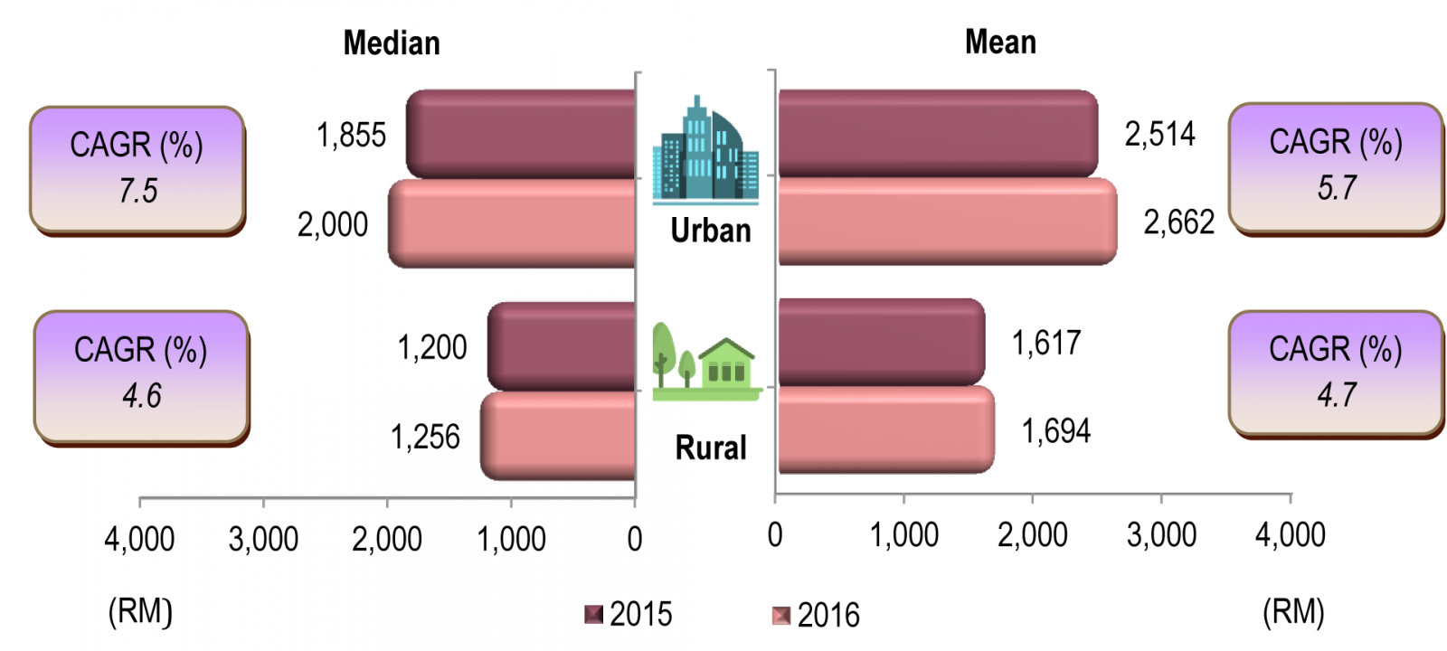 In 2016, the median and mean monthly salaries & wages of employees in the urban area were higher compared to rural area. Likewise, urban area registered higher growth of median and mean monthly salaries & wages compared to rural area. The median monthly salaries & wages of employees in the urban area grew at annual growth rate of 7.5 per cent to RM2,000. Meanwhile, the median of employees in the rural area rose 4.6 per cent to RM1,256. The mean monthly salaries & wages of employees in both areas also recorded increases of 5.7 per cent in the urban area and 4.7 per cent in rural area [Chart 2].