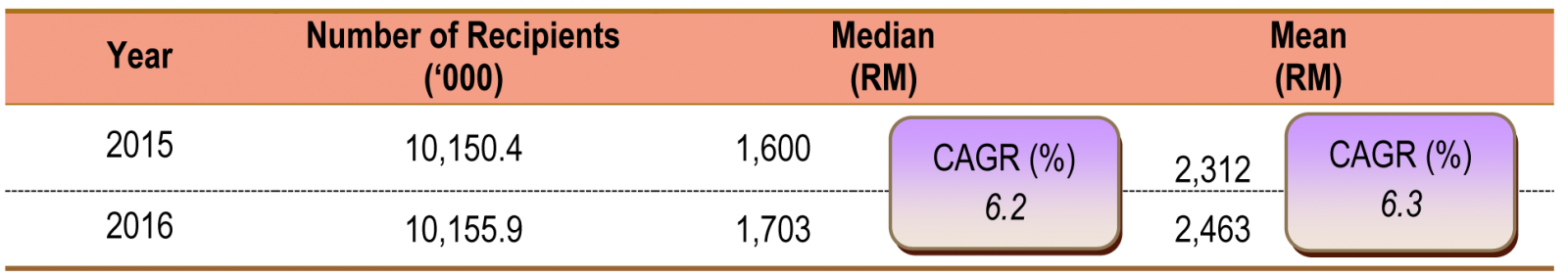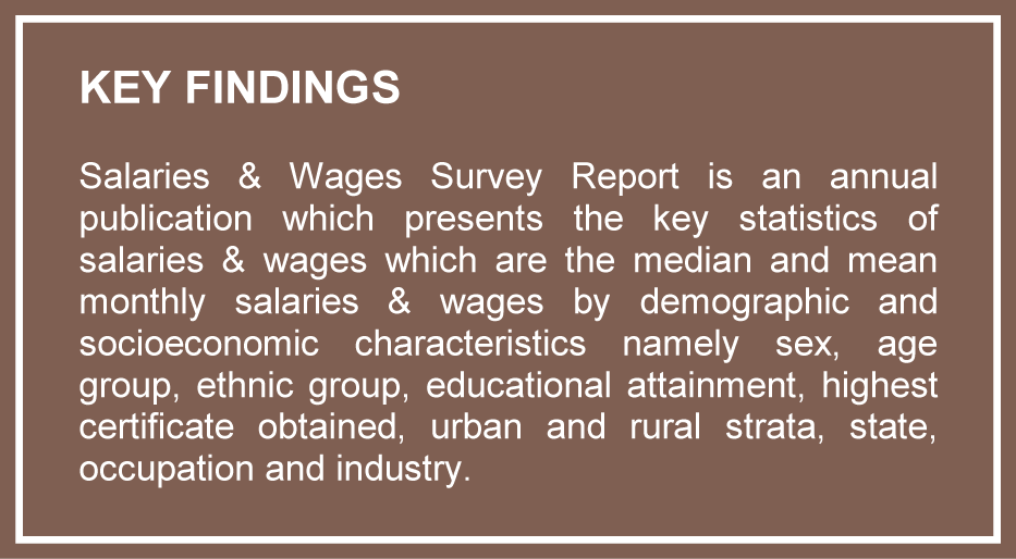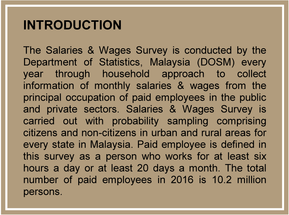 Median and mean monthly salaries & wages of employees improved at 6.2 per cent and 6.3 per cent The median monthly salaries & wages received by paid employees improved by 6.2 per cent to RM1,703 compared to RM1,600 in 2015. Meanwhile, the mean monthly salaries & wages recorded the annual growth rate of 6.3 per cent to RM2,463 compared to RM2,312 in the previous year [Table 1]. |