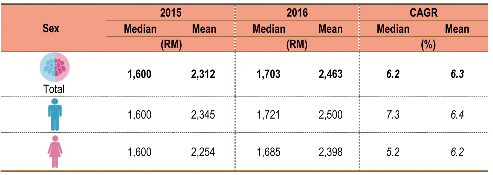Monthly salaries & wages of employees by sex In 2016, the median monthly salaries & wages of male employees was higher at RM1,721 compared to female employees, RM1,685. The median for male employees increased 7.3 per cent while for female increased 5.2 per cent compared to the previous year. Similarly, in terms of the mean, male employees received monthly salaries & wages (RM2,500) higher than female (RM2,398) [Table 2]. |