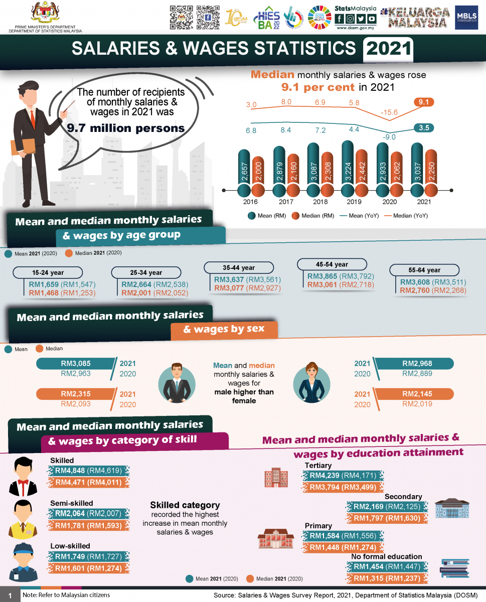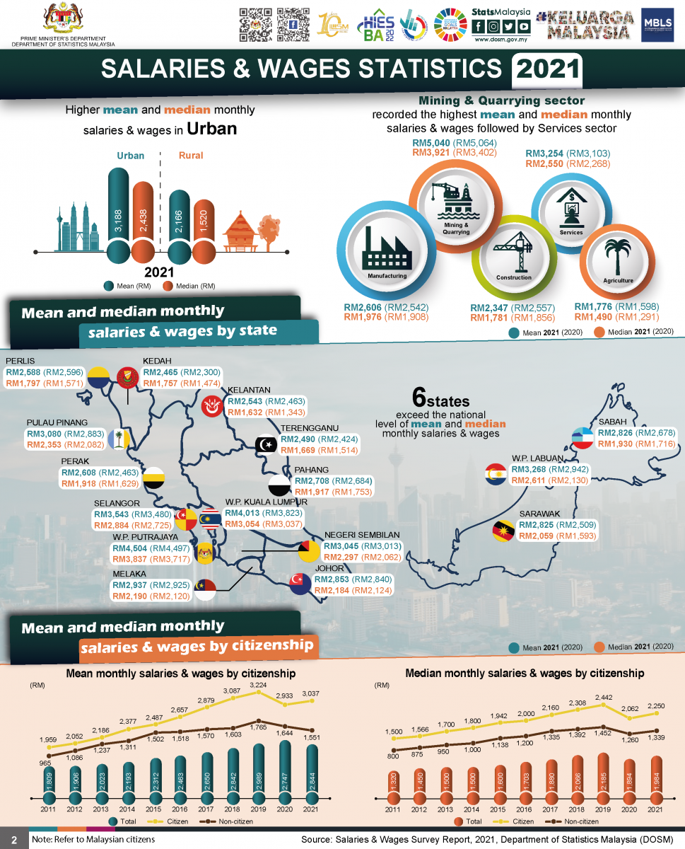 Similarly, the mean monthly salaries & wages rebounded by 3.5 per cent to register RM3,037 after recording a decline for the first-time last year (2020: -9.0%; RM2,933). The rise in median and mean monthly salaries & wages was partly contributed by the continuous resumption of economic and social activities during the second half of the year, after the country was surrounded by the COVID-19 pandemic.