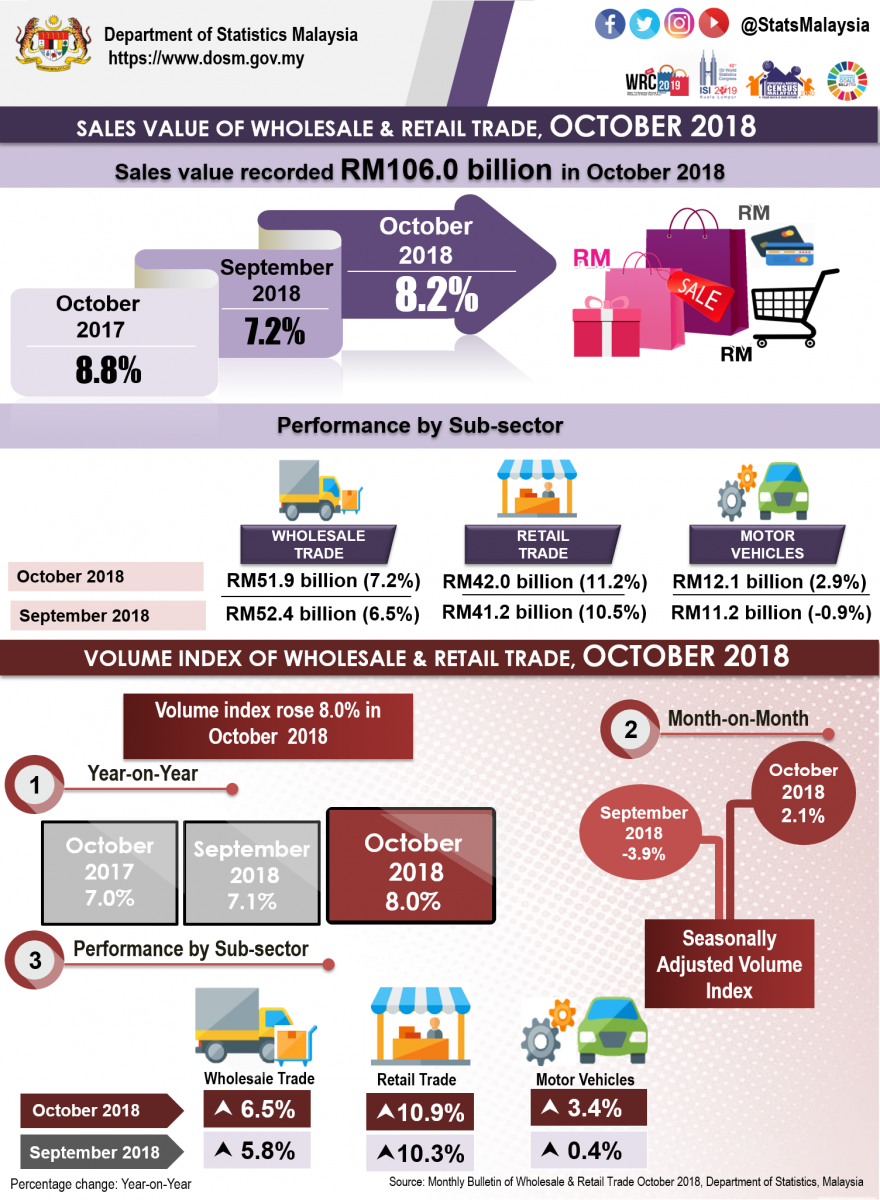 In the month of October 2018, sales of Wholesale & Retail Trade recorded a growth of 8.2 per cent. The increase was attributed by Retail Trade which continued its double-digit growth at 11.2 per cent.