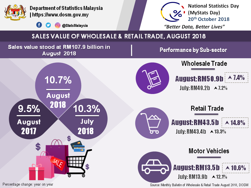 In the month of August 2018, sales of Wholesale & Retail Trade sustained double-digit growth momentum to rise 10.7 per cent to RM107.9 billion. The expansion was attributed by Retail Trade (14.8%) and Motor Vehicles (10.6%).