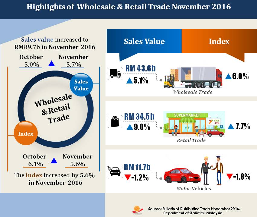 Sales value of Wholesale & Retail Trade increased to RM89.7 billion in November 2016, registering 5.7 per cent growth as compared to the corresponding period in 2015. The sales value consists of Wholesale Trade (RM43.6 billion), Retail Trade (RM34.5 billion) and Motor Vehicles (RM11.7 billion) businesses. The positive growth was contributed by Retail Trade (9.0%) and Wholesale Trade (5.1%) businesses.
