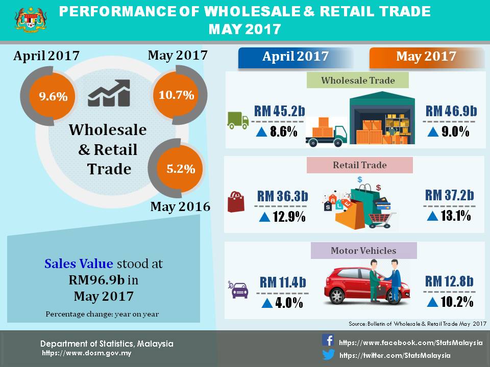 Sales value of Wholesale & Retail Trade recorded a strong growth of 10.7 per cent to RM96.9 billion in May 2017 as compared to RM87.5 billion in 2016. The sales value consists of Wholesale Trade (RM46.9 billion), Retail Trade (RM37.2 billion) and Motor Vehicles (RM12.8 billion) businesses. The positive growth was contributed by Retail Trade (13.1%).