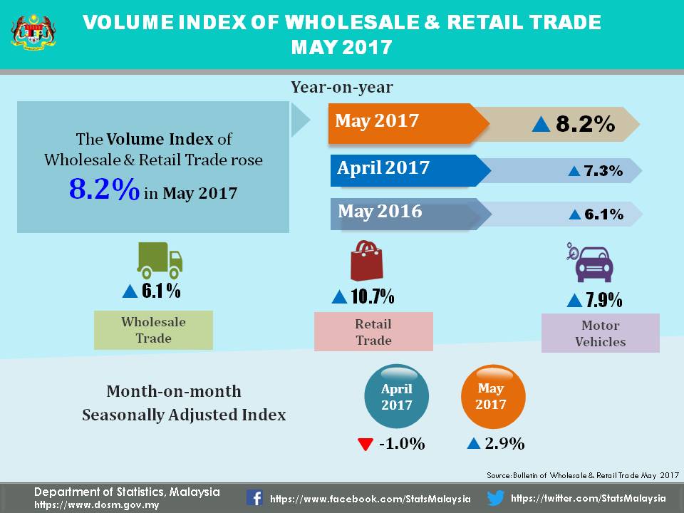 The volume index of Wholesale & Retail Trade rose 8.2 per cent to 156.6 points in May 2017 as compared to May 2016. The growth was supported by the increase in Retail Trade (10.7%). The seasonally adjusted volume index of Wholesale & Retail Trade increased 2.9 per cent as compared to the preceding month.