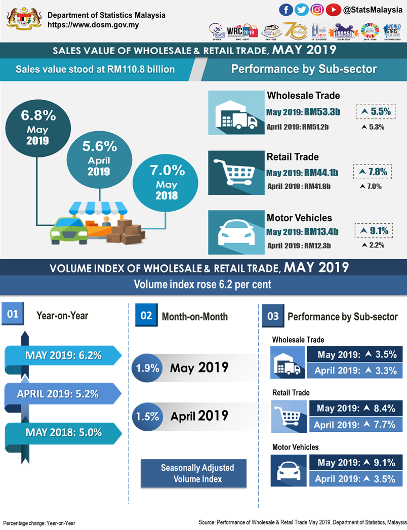 Sales of Wholesale & Retail Trade in May 2019 amounted to RM110.8 billion, grew  6.8 per cent as compared to the same month a year ago. Retail Trade recorded an increase of  RM3.2 billion (+7.8%) followed by Wholesale Trade with RM2.8 billion (+5.5%) and  Motor  Vehicles  with  RM1.1  billion  (+9.1%).  On  monthly  comparison,  sales  value  increased  RM5.4 billion  (+5.1%) after registering a decrease of  3.7 per cent in April 2019.